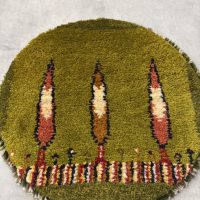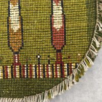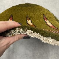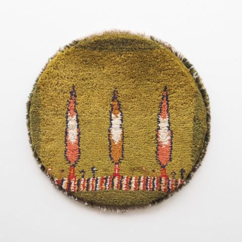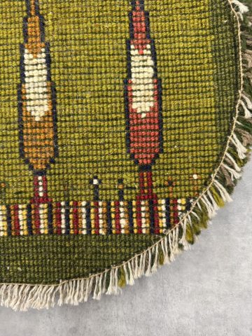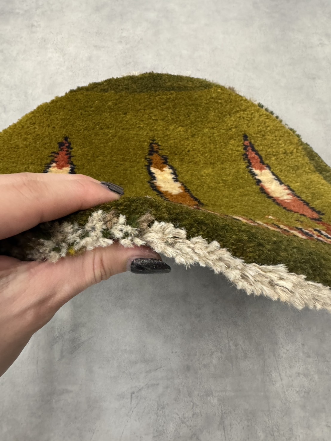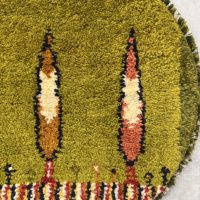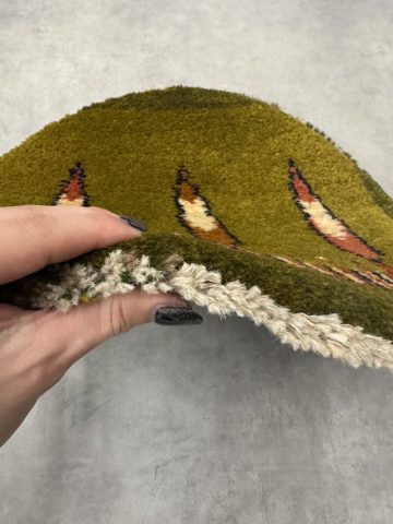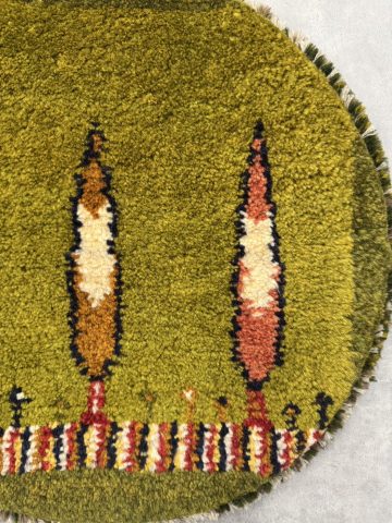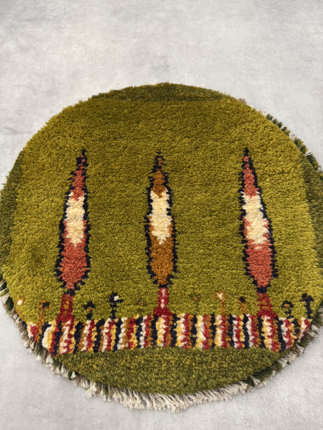 落ち着いたグリーンが印象的な円形ミニギャッベ。生命の樹3本がより明るくアクセントに伸び伸びと草原にそびえ立っているようなイメージの1枚。