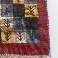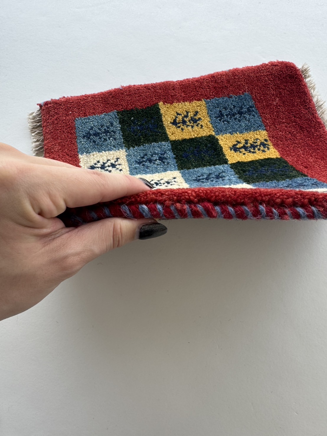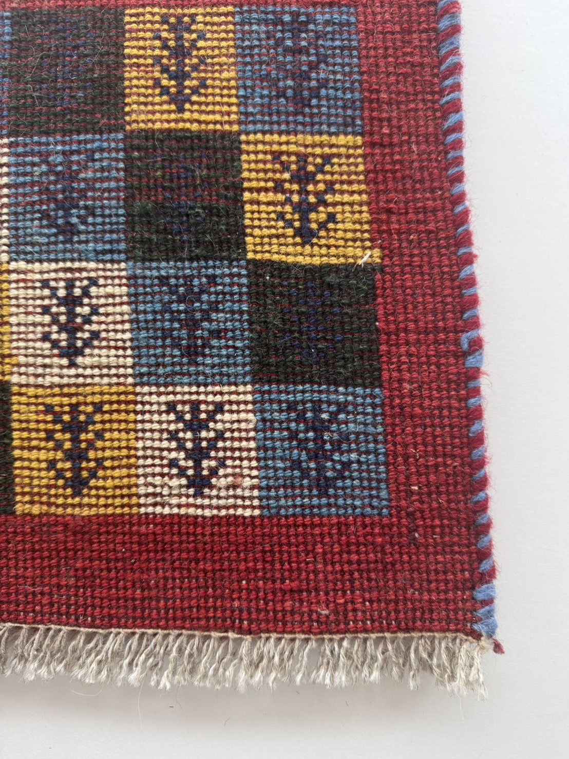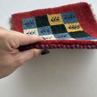 四角形でなく見るからに台形になっている、なんとギャッベらしい、手織りらしい1枚!!! パッチワークの可愛らしい椅子用ギャッベで形も柄もTHEギャッベすぎて可愛くニヤケてしまいますね。