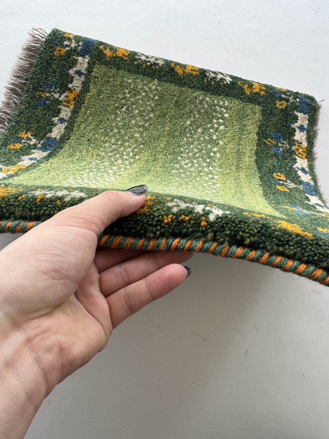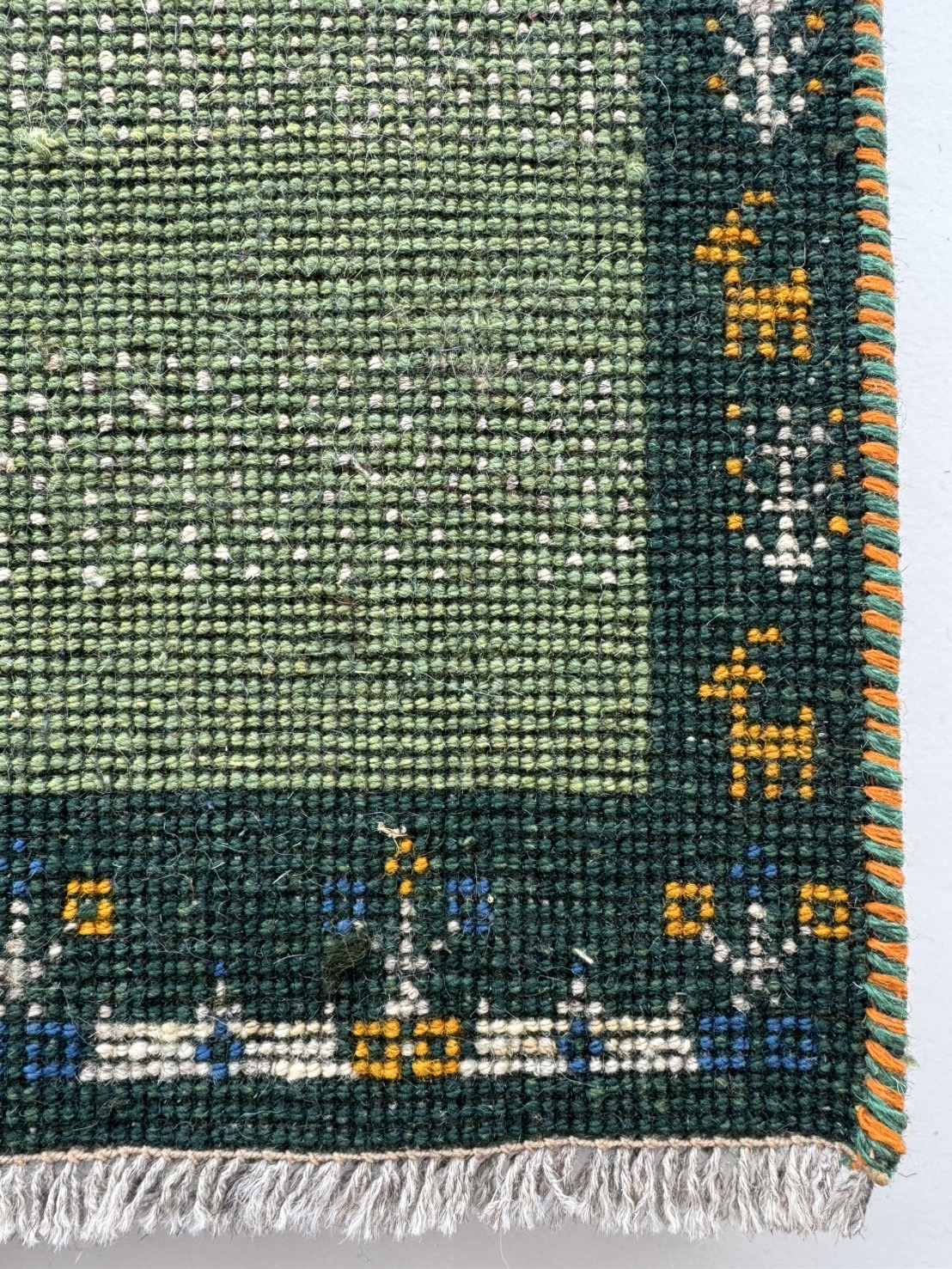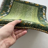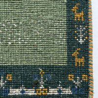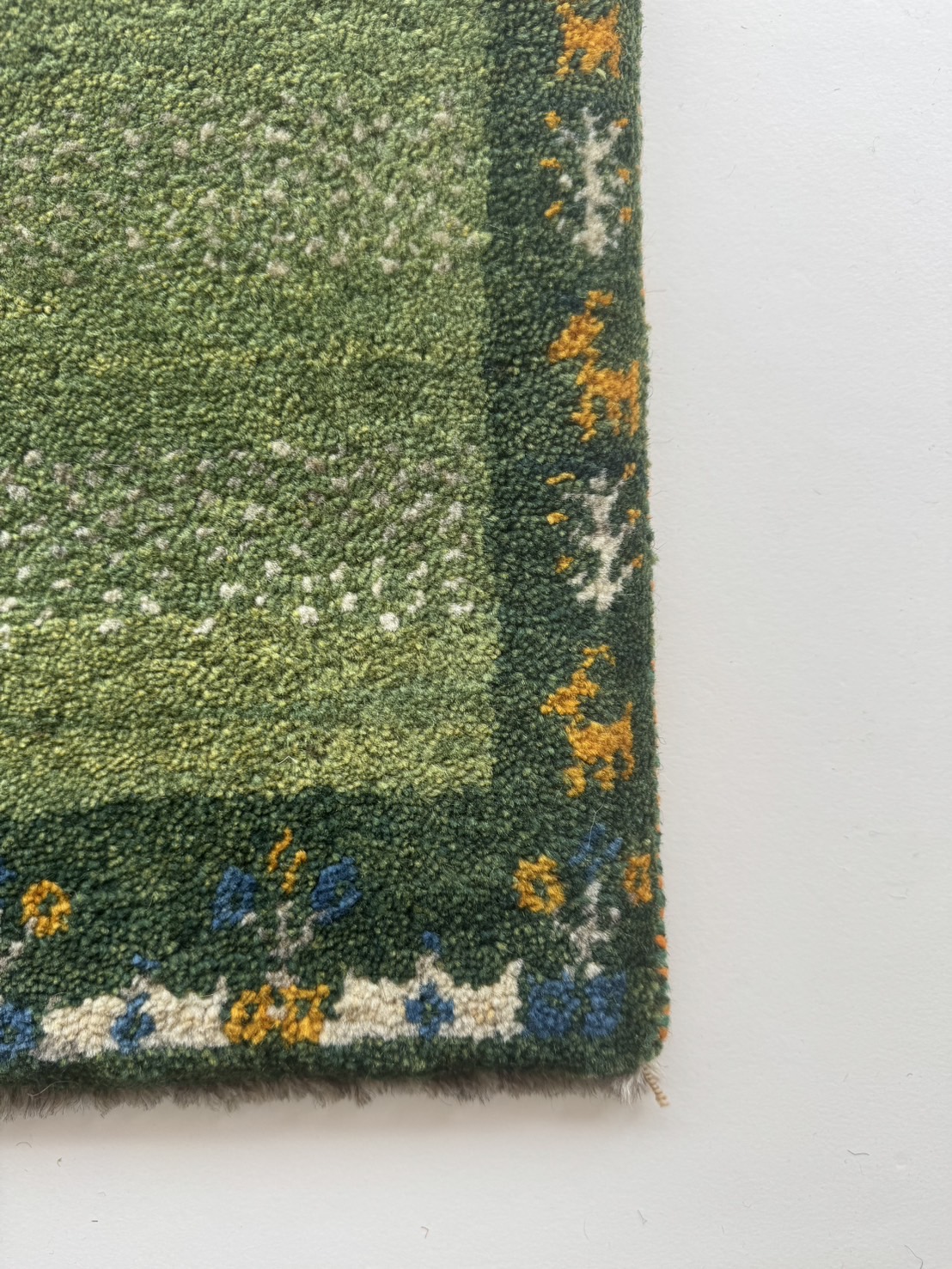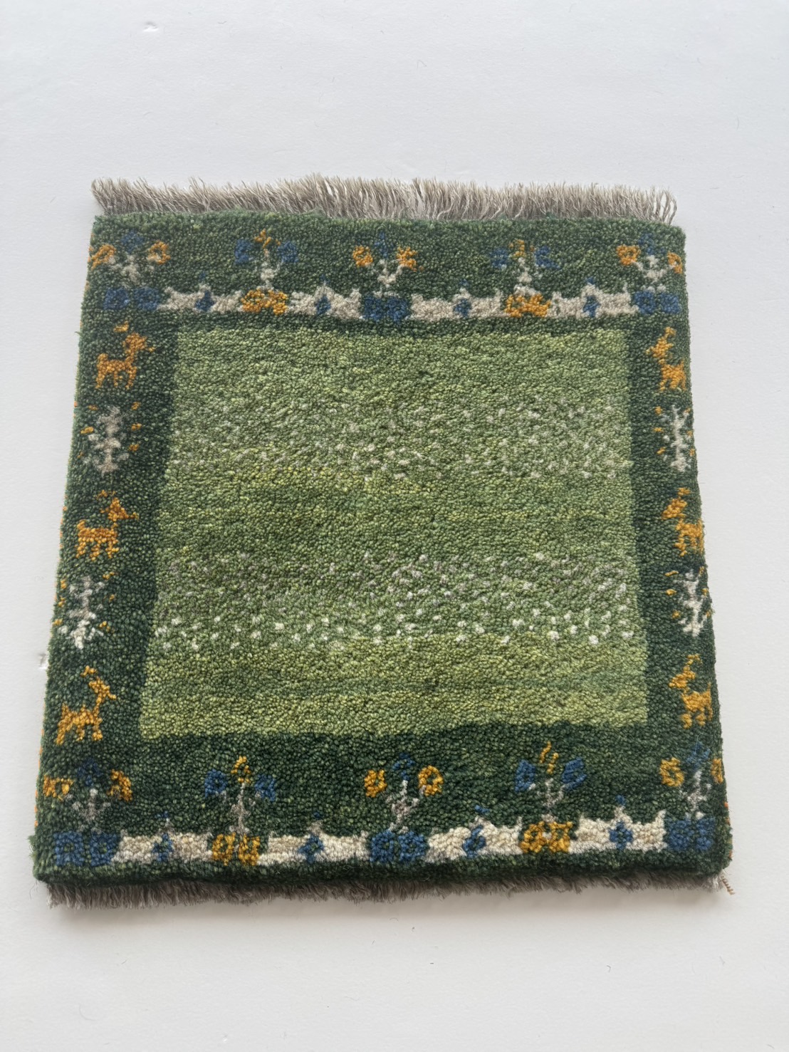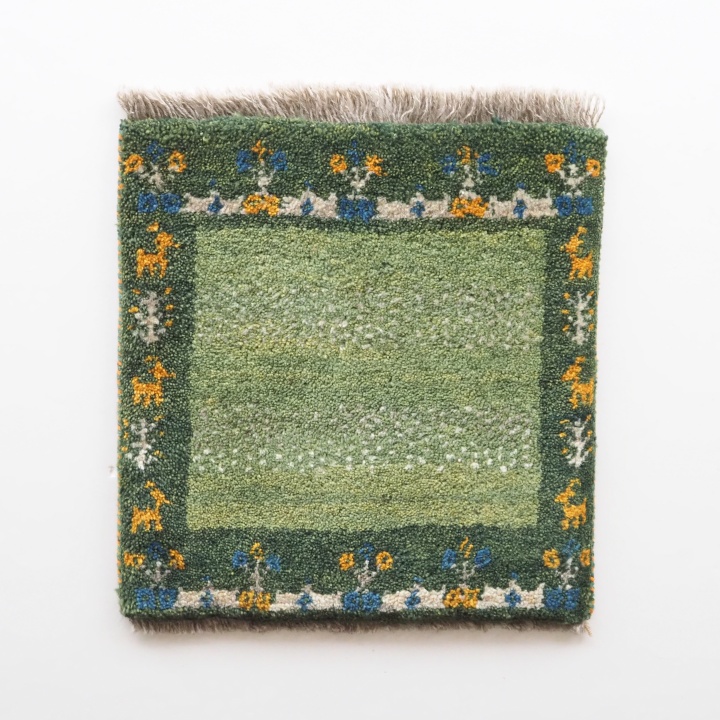 周りに鹿や生命の樹を描いているちょっと変わった1枚。厚みもあり緑のグラデーションがとてもきれいな椅子用ギャッベです。