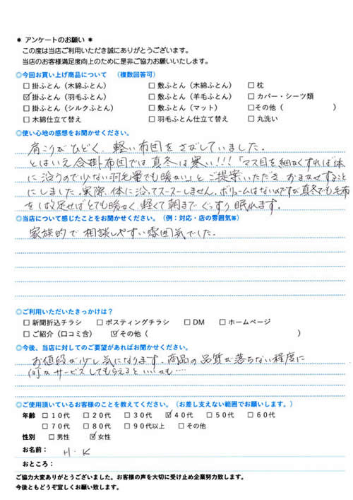 「マス目を細かくすれば体に沿うので少ない羽毛量でも暖かい」とご提案いただき、おまかせすることにしました。実際、体に沿ってスースーしません。ボリュームはないのですが、真冬でも毛布を1枚足せばとても暖かく、軽くて朝までぐっすり眠れます。